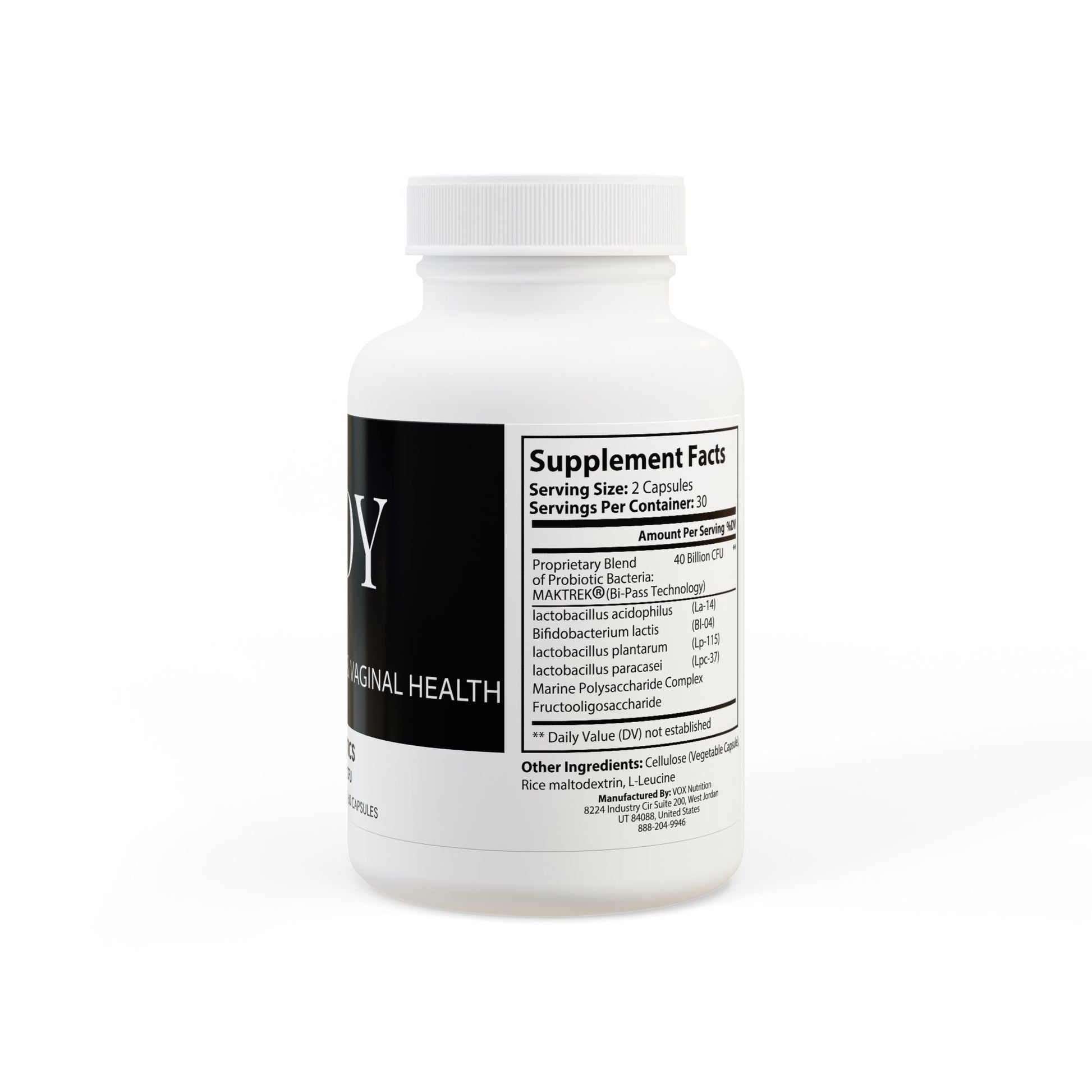 Key ingredients include a Proprietary Blend of Probiotic Bacteria with MAKTREK® (Bi-Pass Technology), Lactobacillus acidophilus, Bifidobacterium lactis, Lactobacillus plantarum, Lactobacillus paracasei, Marine Polysaccharide Complex, and Fructooligosaccharide® (FOS).